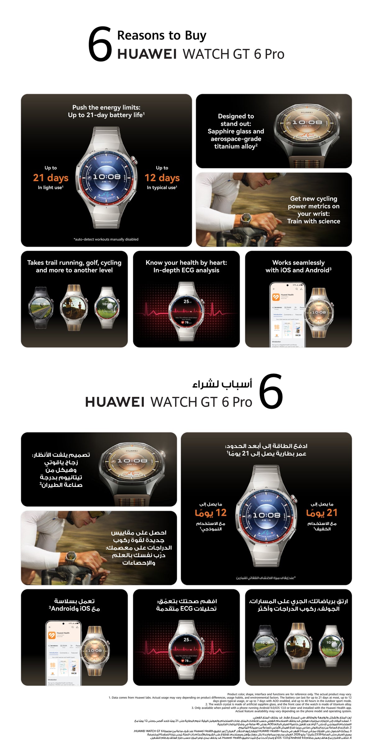 بطارية طويلة العمر للغاية: تصل إلى 21 يومًا. قوي وعصري: زجاج التيتانيوم وسبائك الياقوت. صحة أفضل: تجربة صحية ذكية ومريحة. بطل رياضي: تجربة رياضية جديدة. توافق واسع: IOS وAndroid. التوصيل يبدأ من 1 أكتوبر للطلبات المسبقة.